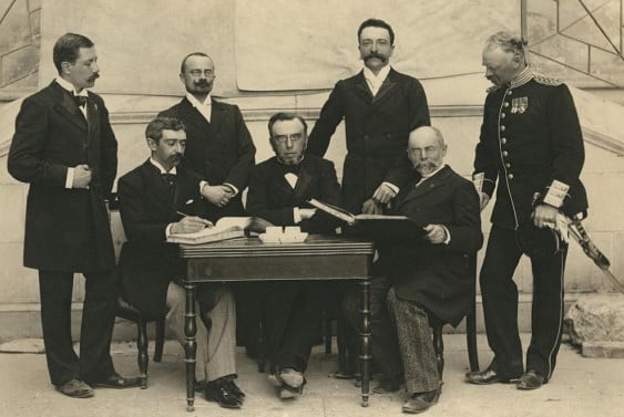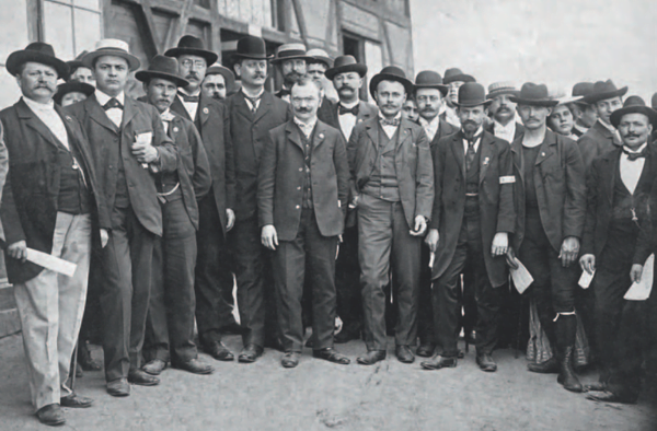 Část prvního Mezinárodního olympijského výboru: zleva: Gebhardt (Německo), Guth-Jarkovský (Čechy), Kemeny (Maďarsko), Balck (Švédsko); sedící: Coubertin, Bikélas v centru, Boutovskij (Rusko). Zdroj: fr.wikipedia.org
