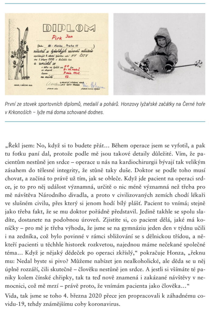Kalendář má nabitý k prasknutí, dělá besedy, pracuje, jezdí školit mladé doktory do rozvojových zemí, v polních podmínkách operoval srdce i během dovolené v Nepálu, mezi kamarády má Petra Jandu, Petra Štěpánka, Zlatu Adamovskou, hrál sám sebe v Ordinaci v Růžové zahradě, a přesto si najde čas a zajde si jako štamgast na pivo na Žižkov nebo na fotbal na Slavii. Honza Pirk je totiž člověk, který má nejen zdravé srdce, ale i dobré. Snaží se být pokorný a to stejné vyžaduje od ostatních, za pacienty bojuje do roztrhání těla, poskytuje bezplatné telefonické i emailové konzultace komukoliv, kdo slušně požádá. Nikdy nezvýší hlas, ale na své podřízené má obrovské nároky. To vše se naučil na stáži v USA. Doteď zpravidla ihned po operaci bere telefon a volá příbuzným, jak to celé dopadlo. Lidé v jeho okolí si ho proto bezbřeze váží. A mají k tomu podle mého opravdu důvod.