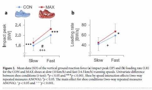 Autoři zjistili, že vysoce odpružené maximalistické boty mění mechaniku běhu podobnou pružině a spíše zesilují, než tlumí nárazové zatížení. Tento překvapivý výsledek byl výraznější při vysoké rychlosti běhu (14,5 km/h), kde byl vrchol nárazové síly země a rychlost zatížení o 10,7 % a 12,3 % vyšší v maximalistické botě ve srovnání s běžnou botou, zatímco jen nepatrně vyšší nárazová špička (6,4 %) byla zjištěna při rychlosti 10 km/h s maximalistickou botou.